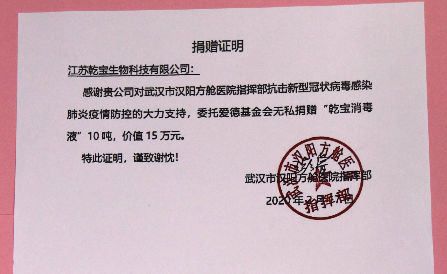 2020年2 月16日,江蘇德?lián)渲枪俜骄W站集團組織旗下的德?lián)渲枪俜骄W站生物科技有限公司聯(lián)手蘇州鴻越文化發(fā)展有限公司,委托愛德基金會再次向武漢捐贈消毒液30噸,其中向雷神山和方艙兩家醫(yī)院捐贈消毒液各10噸,向湖北省軍區(qū)保障局捐贈消毒液 10噸。