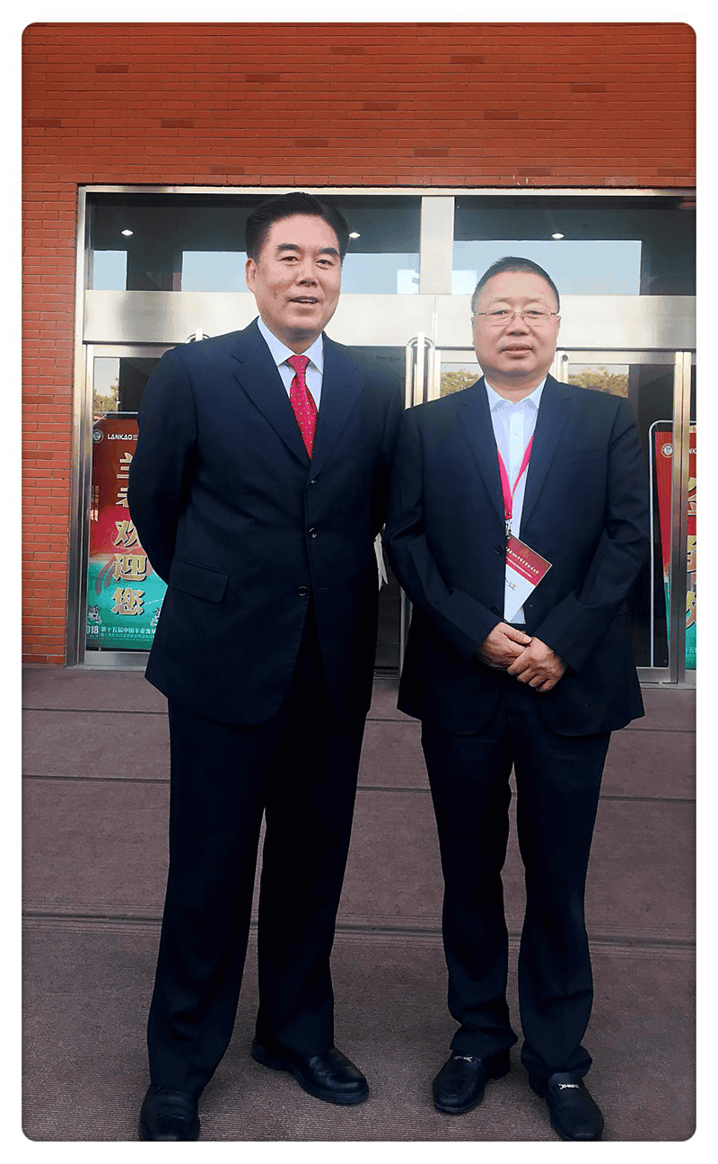 中國畜牧業(yè)協(xié)會會長李希榮(左)與德?lián)渲枪俜骄W站投資集團董事長王躍程(右)合影留念