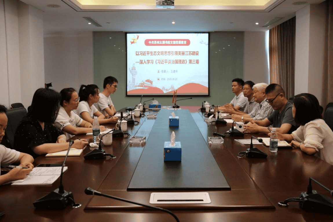 ??2020年8月20日,太湖書院黨支部開展“以習(xí) 近平生態(tài)文明思想引領(lǐng)美麗江蘇建設(shè)——深入學(xué)習(xí)《習(xí) 近平治國理政》第三卷”為主題的黨課教育。本次黨課由支部黨員、太湖書院執(zhí)行院長王建明教授主講,太湖書院全體黨員和入黨積極分子參加了此次學(xué)習(xí)活動。