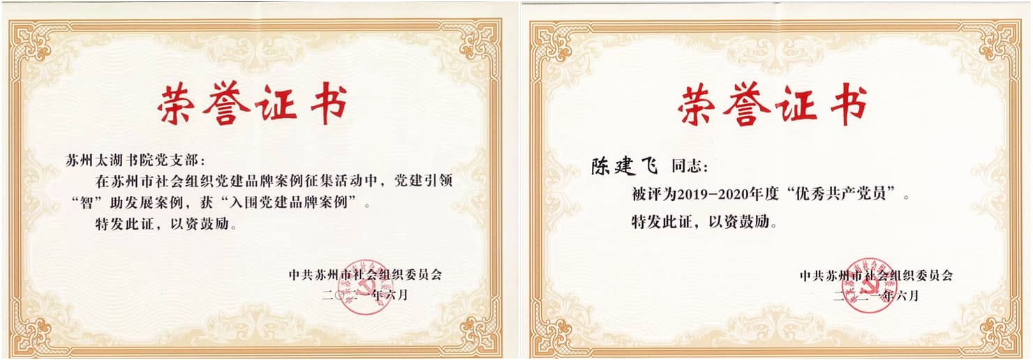 太湖書院黨支部自成立以來,始終堅(jiān)持以習(xí) 近平新時(shí)代中國特色社會(huì)主義思想為指導(dǎo),在蘇州市社會(huì)組織黨委的領(lǐng)導(dǎo)下,不斷加強(qiáng)黨的建設(shè),凝聚黨員,引領(lǐng)群眾,促進(jìn)內(nèi)涵發(fā)展,同時(shí)立足書院自身實(shí)際,充分發(fā)揮智庫功能優(yōu)勢,探索出一條“黨建+智庫”的民非社會(huì)組織基層黨建新模式。在6月份蘇州市社會(huì)組織黨委舉辦的慶祝建黨100周年暨“紅社發(fā)布”活動(dòng)上,書院黨支部“黨建引領(lǐng),‘智’助發(fā)展”案例成功入圍百個(gè)社會(huì)組織黨建品牌案例,中共太湖書院黨支部被評為“先進(jìn)基層黨組織”,支部宣傳委員陳建飛同志被評為“優(yōu)秀共產(chǎn)黨員”。